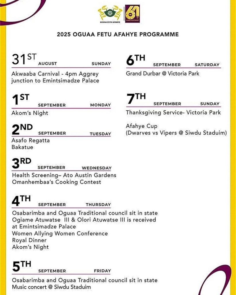 The 61st Oguaa Fetu Afahye will climax with a grand durbar on 6th September, 2025 and is being held under the theme: “Innovate to Elevate: Harnessing the Creative Economy for Sustainable Growth.”