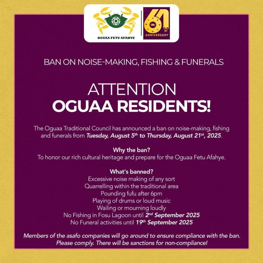 The Ban on noise-making, fishing and funerals begins today, Tuesday August 5, 2025 within the Oguaa Traditional Area, Cape Coast as part of preparations for the annual Oguaa Fetu Afahye festival.