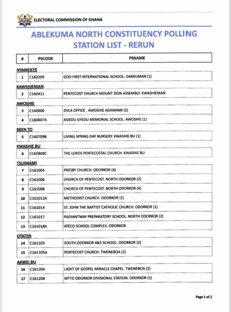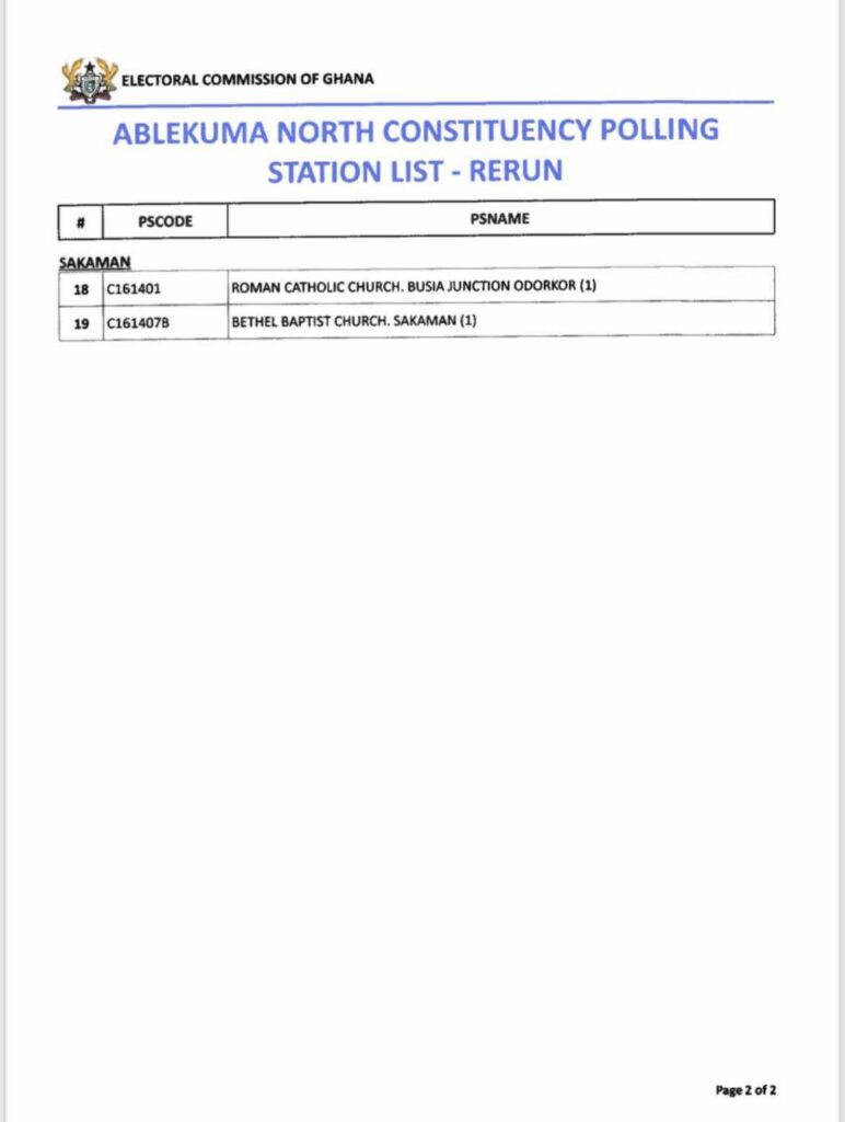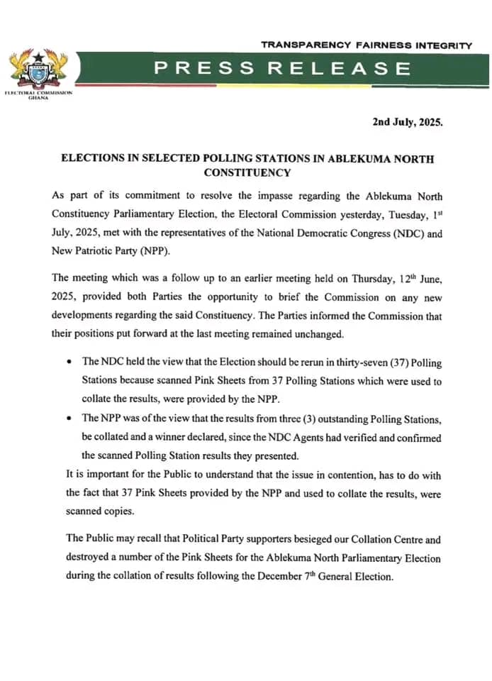 The Electoral Commission (EC) Has Announced A Rerun Of The Ablekuma North Constituency Parliamentary elections in 19 out of the 37 polling stations following a meeting it held with representatives of the National Democratic Congress and New Patriotic Party yesterday Tuesday, 1st July 2025.