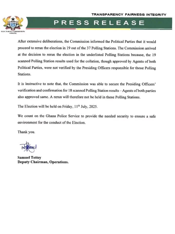 In a statement signed by the Deputy Chairperson of the Commission Samuel Tettey, the Commission stated that the rerun will be held on Friday, 11th July, 2025.
