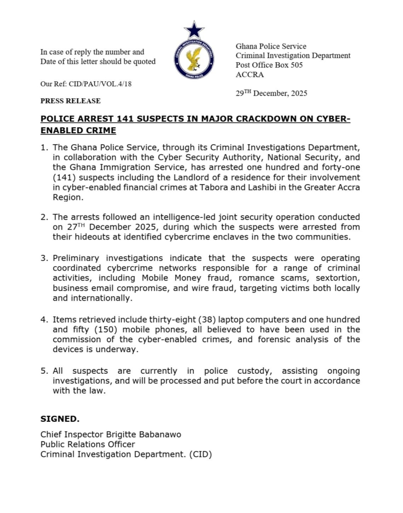 The Ghana Police Service has arrested 141 suspects, including a landlord, in a major intelligence-led operation targeting cyber-enabled financial crimes in parts of the Greater Accra Region.