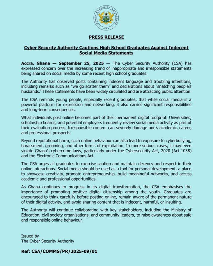 The Cyber Security Authority (CSA) has issued a stern caution to recent high school graduates over the posting of indecent content on social media.