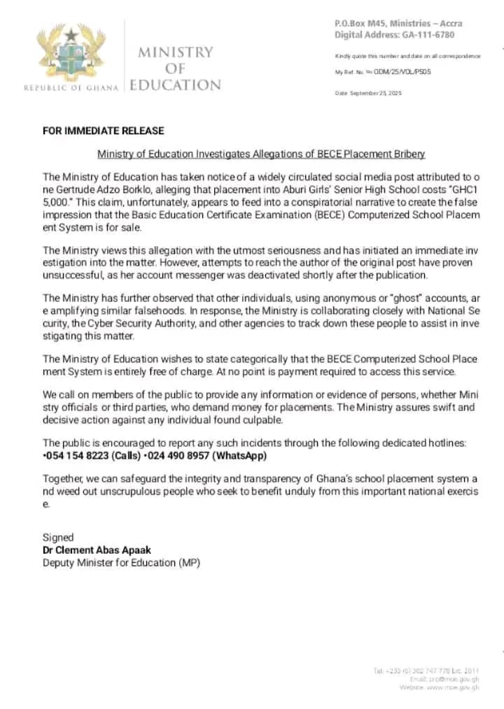 The Ministry of Education has announced investigations into a viral social media post alleging that admission into Aburi Girls Senior High School costs GHC 15,000.
