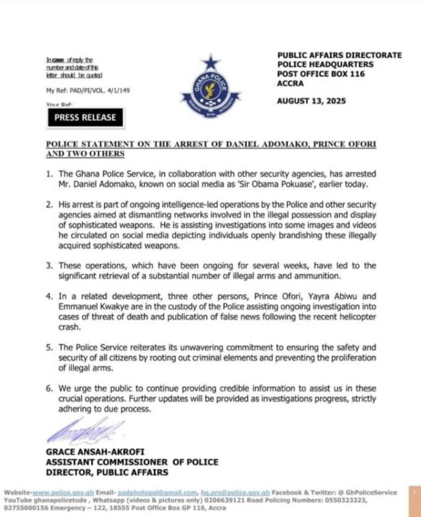 The Police also confirmed that three others, Prince Ofori, Yayra Abiwu, and Emmanuel Kwakye are in custody assisting investigations into alleged death threats and the publication of false news linked to the fatal helicopter crash, which claimed the lives of eight military personnel.