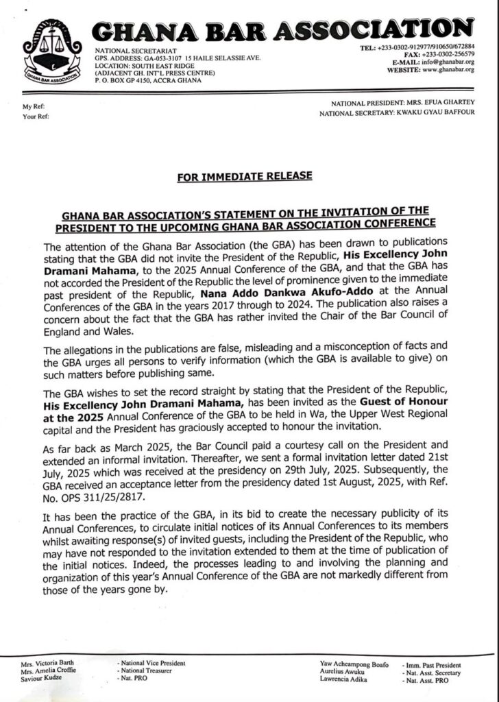 The Ghana Bar Association (GBA) has dismissed reports suggesting that it did not invite President John Dramani Mahama to its 2025 Annual Conference, describing the claims as “false, misleading and a misconception of facts.”