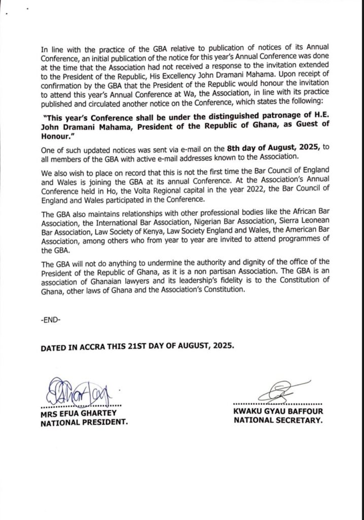 The Association further clarified that the absence of the President’s name in initial notices was due to pending confirmation. “In line with the practice of the GBA relative to publication of notices of its Annual Conference, an initial publication was done at the time that the Association had not received a response to the invitation extended to the President,” it said.