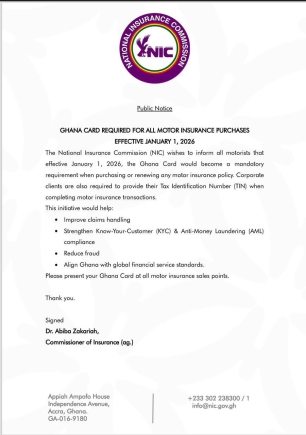 “Please present your Ghana Card at all motor insurance sales points,” the NIC said in its public notice, stressing that compliance will be mandatory from the start of 2026.