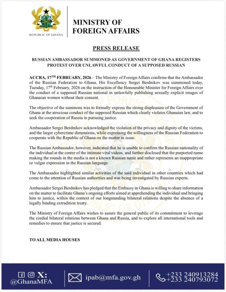 In a statement issued on Tuesday, February 17, 2026, the Ministry of Foreign Affairs confirmed that Ambassador Sergei Berdnikov was invited to the Ministry on the instruction of the Minister for Foreign Affairs to register Ghana’s strong protest over what it described as “atrocious conduct.”