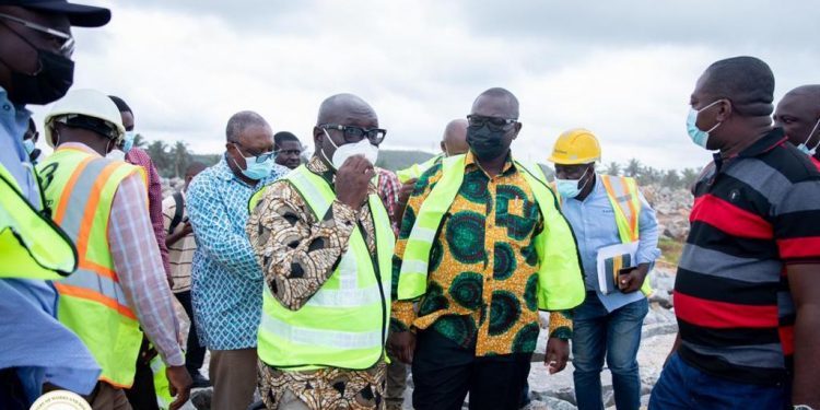 “I’m very impressed with the work I’ve seen here so far.  This project was meant to one Tech’s this famous European castle, Cape Coast Castle, because of its tourist potential.  It also supposed to enhance fishing activities here in Cape Coast.  So, the project is supposed to enhance fishing activities. And it’s also supposed to protect lives, and property, all these building, the sea defense projects are going to protect them. And I’m happy to see that this fishing bay, the water there is being stabilized so that Fisher folks can walk their canoes and go about their normal duties. That is what the project is about. And even though the project is now 60% in completion, it has started yielding results. I want to take this opportunity to commend the contractor, Volous Construction for a good job done not realize about this project is that there is a community and technical interface. It’s as a result of the interface between the community and the consultants that this project was designed by since coming here. I’ve heard from the residents. I’ve also heard from the officials, managers of the customer. And we’ve expressed concerns regarding the implementation of the projects and that is what my monitoring visit is about. So that we incorporate the proposed concern to make the project very beneficial to the people. So all these concerns will be taken care of technically, we factored in as the implementation goes on so that this the customer this side will be protected”.