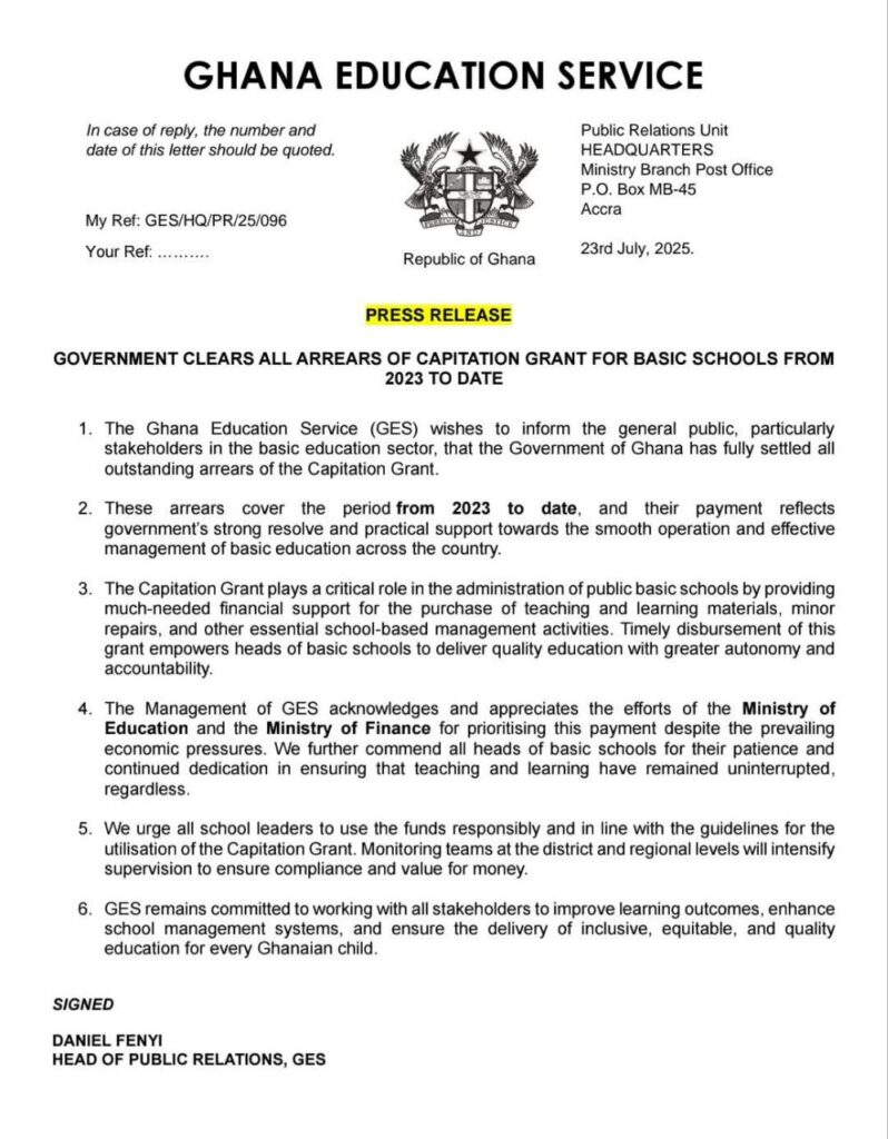 The Ghana Education Service (GES) has announced that the Government of Ghana (GoG) has settled all arrears of the Capitation Grant for basic schools across the country.