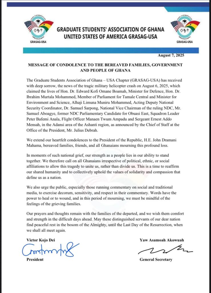 The Graduate Students Association of Ghana – USA Chapter (GRASAG-USA) has expressed profound sorrow over the tragic Z-9 military helicopter crash on August 6, 2025, in Adansi Akrofuom, which claimed the lives of eight distinguished Ghanaians, including: