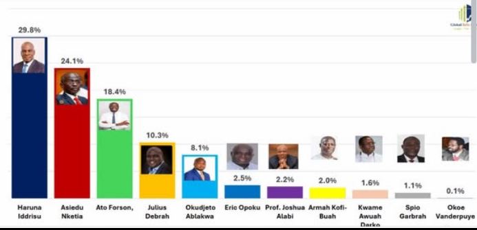 A new survey by Global Info Analytics has positioned Member of Parliament for Tamale South, Haruna Iddrisu, as the leading contender in the National Democratic Congress (NDC) flagbearer contest ahead of the 2028 general election.
