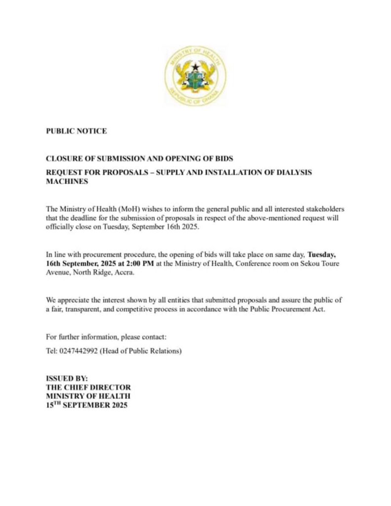 The Ministry of Health (MoH) has officially closed the submission of bids for the supply and installation of dialysis machines across the country.