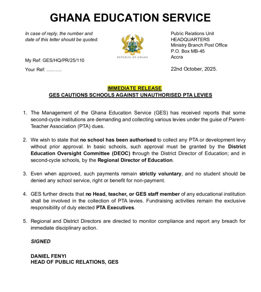 The directive also prohibits heads of schools, teachers, and any GES staff from directly collecting PTA levies. Instead, fundraising is to be handled solely by elected PTA executives, ensuring accountability and transparency.