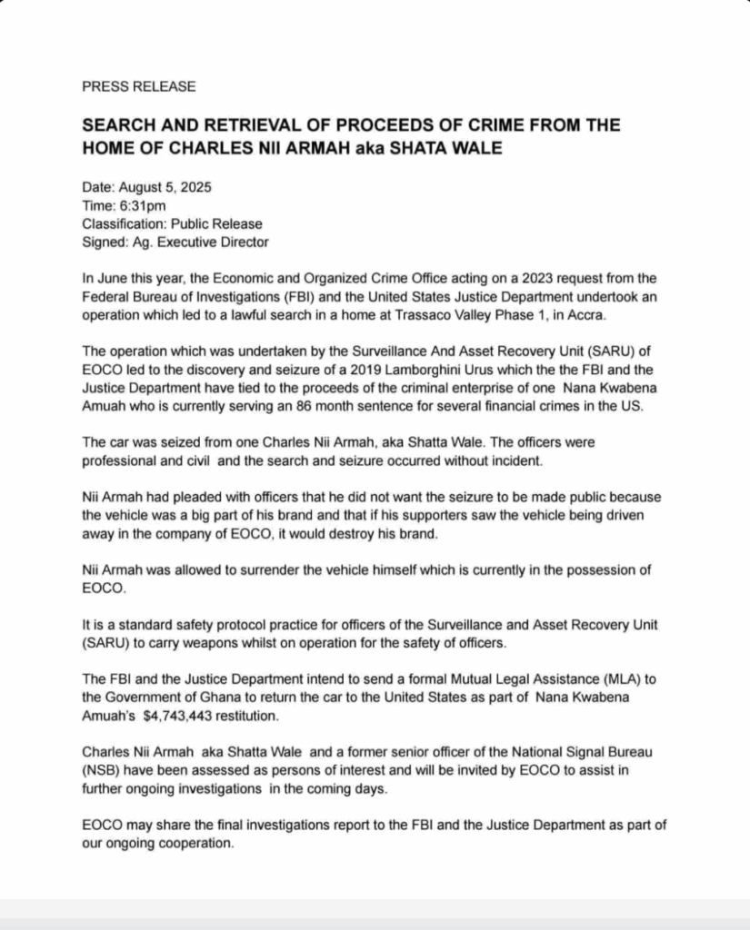 Dancehall star Shatta Wale made headlines again as armed officers from the Economic and Organised Crime Office (EOCO) raided his East Legon residence to confiscate a Lamborghini linked to an international vehicle theft ring. The emotional artist took to social media, claiming he purchased the car legitimately and stating, “I’ve suffered for my money,” as fans and critics debated the unfolding drama.