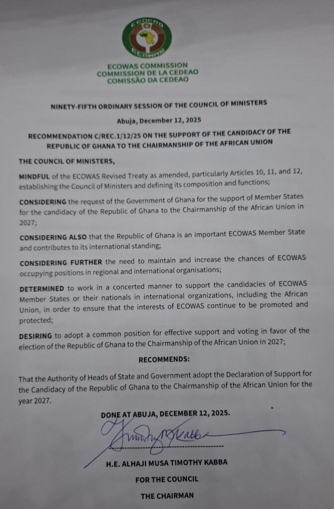 In a statement issued on Friday, December 12, ECOWAS expressed appreciation to its member states for their collective support of Ghana’s candidacy, noting that consensus around a single candidate strengthens the bloc’s influence within the African Union and other international organizations.