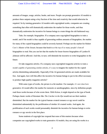 The plaintiffs did not present a “potentially winning argument” that Meta’s copying would flood the market with similar works, causing market dilution, according to Judge Chhabria. He also referenced the Anthropic ruling, noting that Judge William Alsup dismissed concerns about the harm generative AI could inflict on the market for the works it utilizes for training.