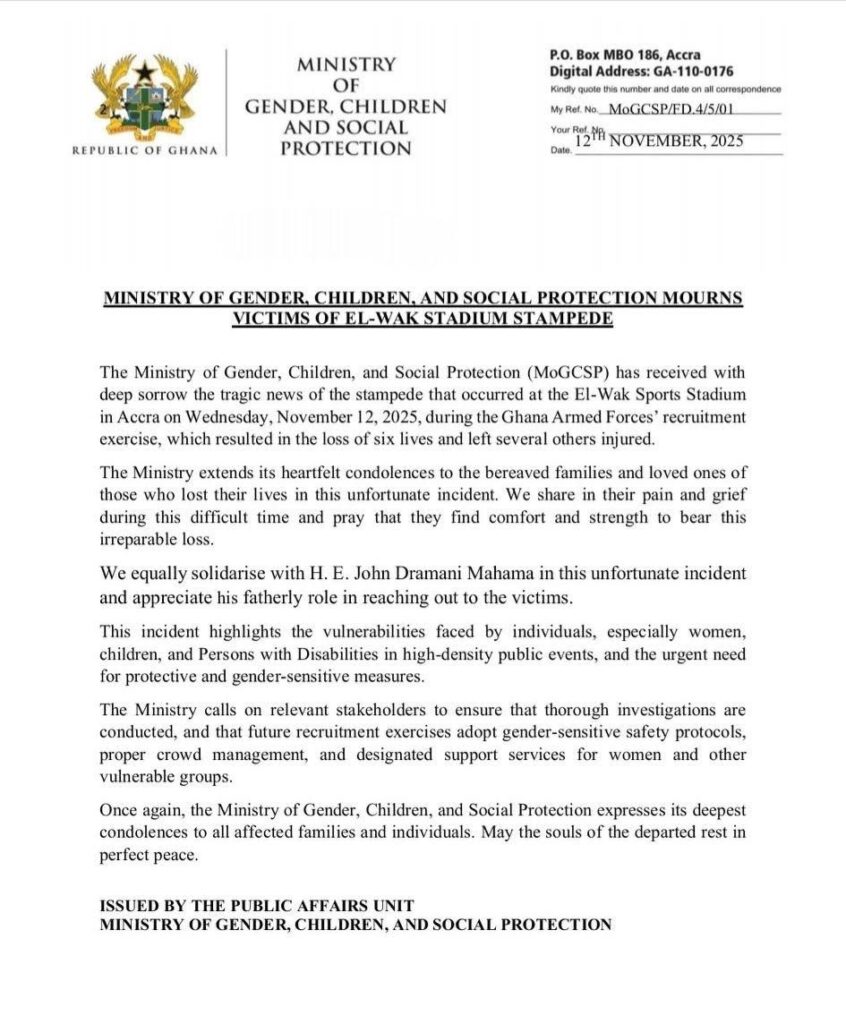 In a statement, the Ministry said that the stampede incident, which occurred at the El-Wak Sports Stadium in Accra on November 12, 2025, and claimed the lives of 6 potential female recruits, “highlights the vulnerabilities faced by individuals, especially women, children, and Persons with Disabilities in high-density public events.”
