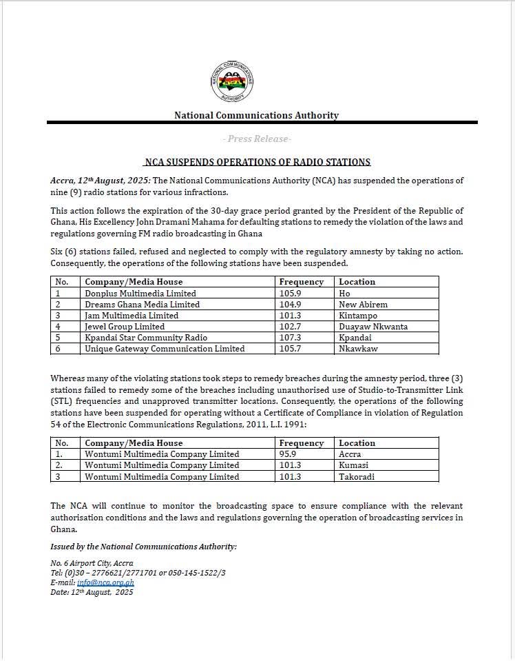 The National Communications Authority (NCA) has suspended the operations of nine radio stations across the country for various infractions, following the expiration of a 30-day grace period granted by President John Dramani Mahama.
