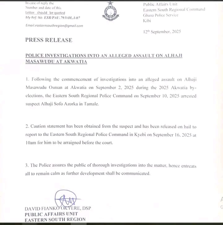 The Ghana Police Service has confirmed the arrest of Alhaji Sofo Azorka in connection with an alleged assault on Alhaji Masawudu Osman during the Akwatia by-elections on September 2, 2025.