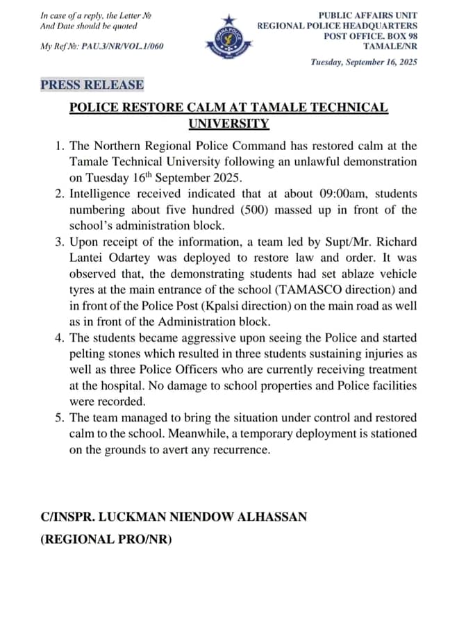 The Northern Regional Police Command says it has restored calm at the Tamale Technical University following a violent clash between students and police officers during an unlawful demonstration on Tuesday, September 16, 2025.