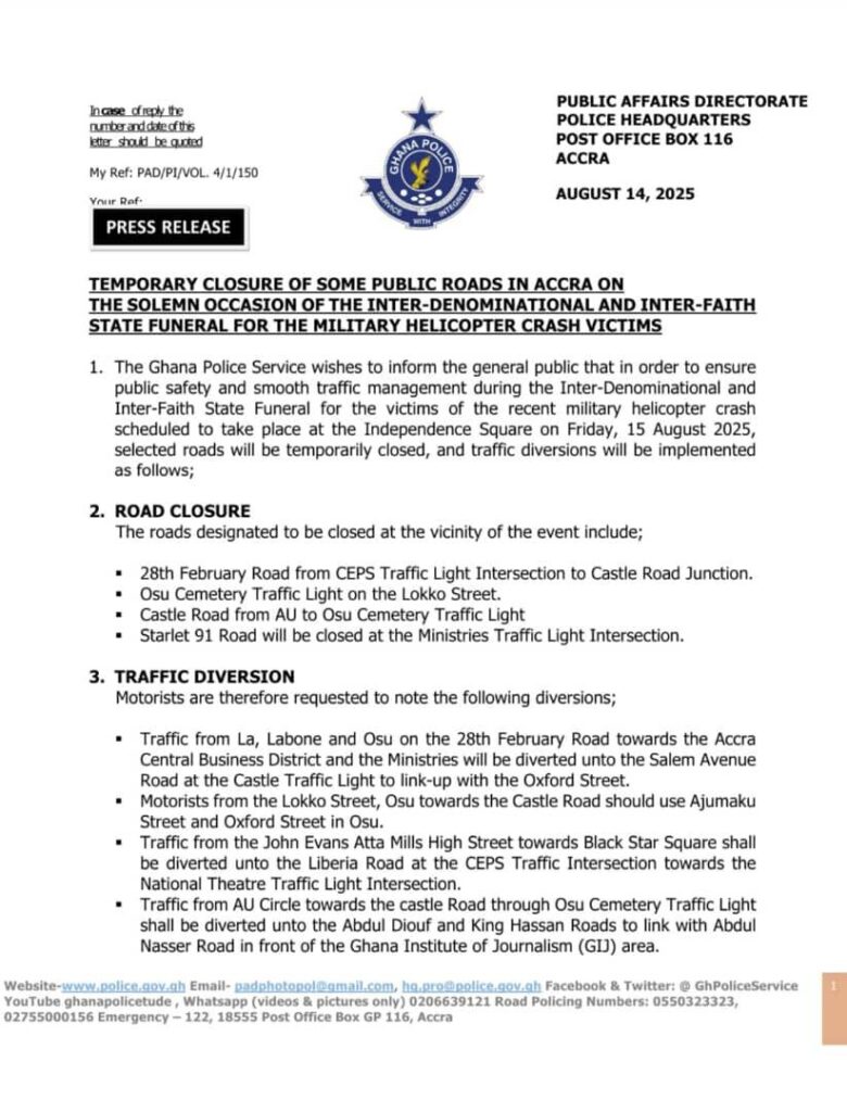 Relatedly, The Ghana Police Service has announced the temporary closure of selected roads in Accra and the implementation of traffic diversions to ensure public safety and smooth vehicular movement during the state funeral for victims of the recent military helicopter crash.