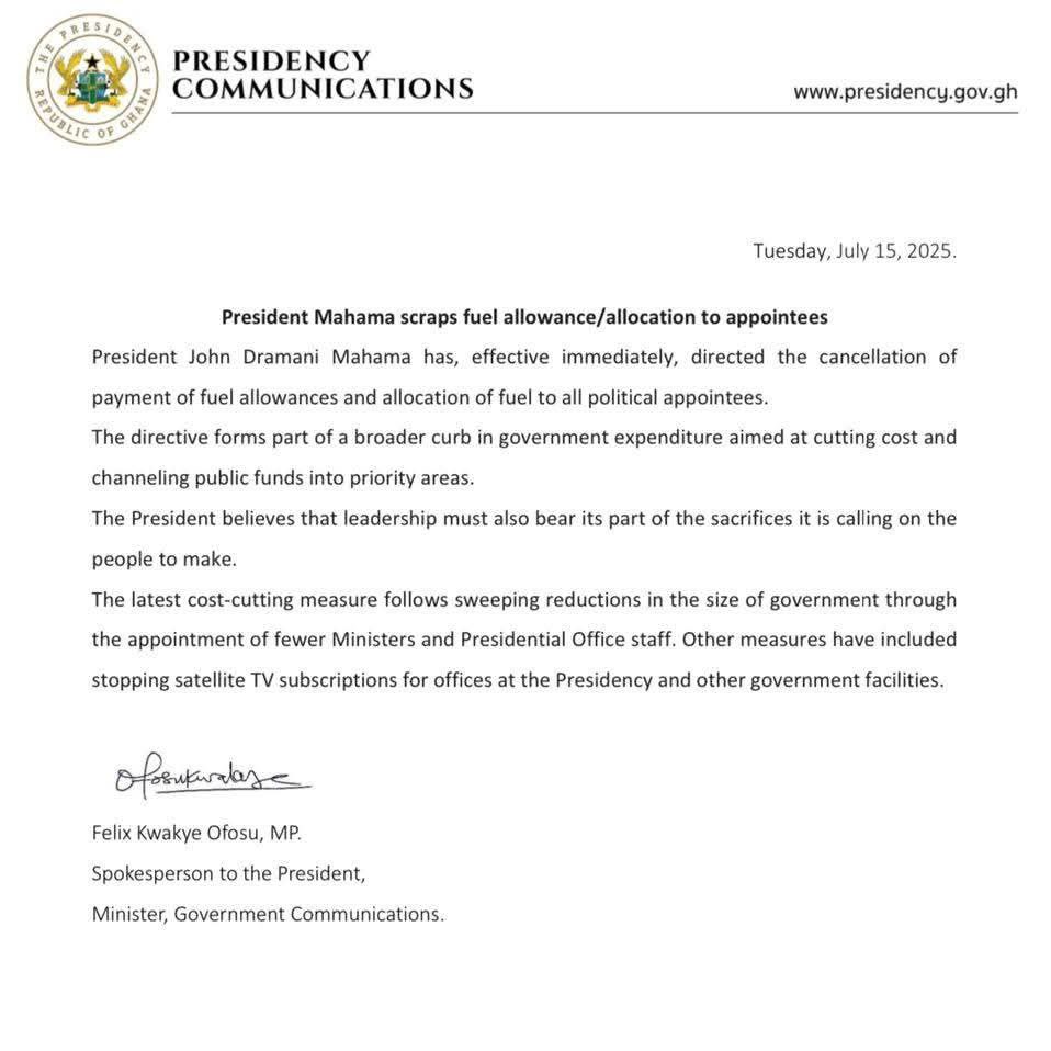 President Mahama has effective immediately, directed the cancellation of payment of fuel allowances and allocation of fuel to all political appointees.