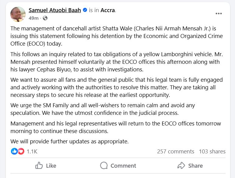 In a message on social media handle, Facebook, Artiste Manger for Shatta Wale, Samuel Atuobi Baah popularly known as Sammy Flex explained that the “Ayoo” hitmaker presented himself voluntarily to EOCO accompanied by his lawyer, Cephas Biyuo and would be back today, Thursday, 21st August 2025 to continue with proceedings.
