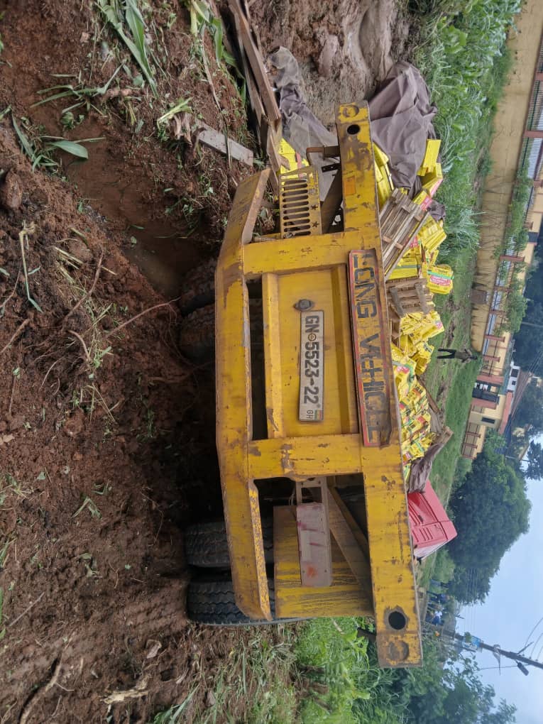 According to the Deputy PRO of the Ghana National Fire Service, ADO1 Fiifi Daadze, the tipper truck with registration number GN5523-22, loaded with tiles from Accra to Takoradi suffered a burst tire on the near side-specifically the front driver’s side causing the driver to lose control and the vehicle fell into a nearby ditch.