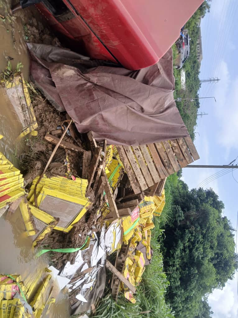 According to the Deputy PRO of the Ghana National Fire Service, ADO1 Fiifi Daadze, the tipper truck with registration number GN5523-22, loaded with tiles from Accra to Takoradi suffered a burst tire on the near side-specifically the front driver’s side causing the driver to lose control and the vehicle fell into a nearby ditch.