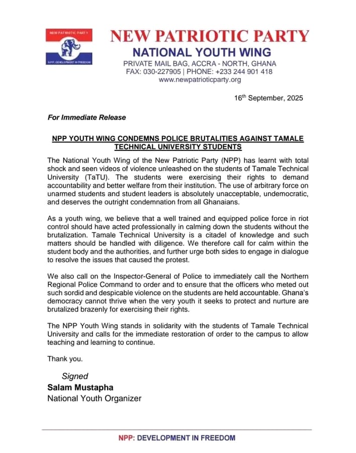 The Youth Wing of the New Patriotic Party (NPP) has strongly condemned alleged acts of police brutality against students of the Tamale Technical University.